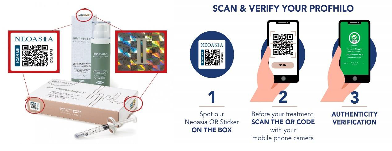 Penting untuk memperhatikan stiker keaslian Neoasia, barcode dan nomor seri bebas kerusakan pada kotak Profhilo. Saat menerima perawatan di Singapura, Malaysia, Vietnam, Indonesia, dan Filipina. Hanya dengan stiker, itu berarti Profhilo dikirim melalui logistik cold chain farmasi, sehingga memastikan integritas produk dan menegaskan bahwa sumber produk itu asli.